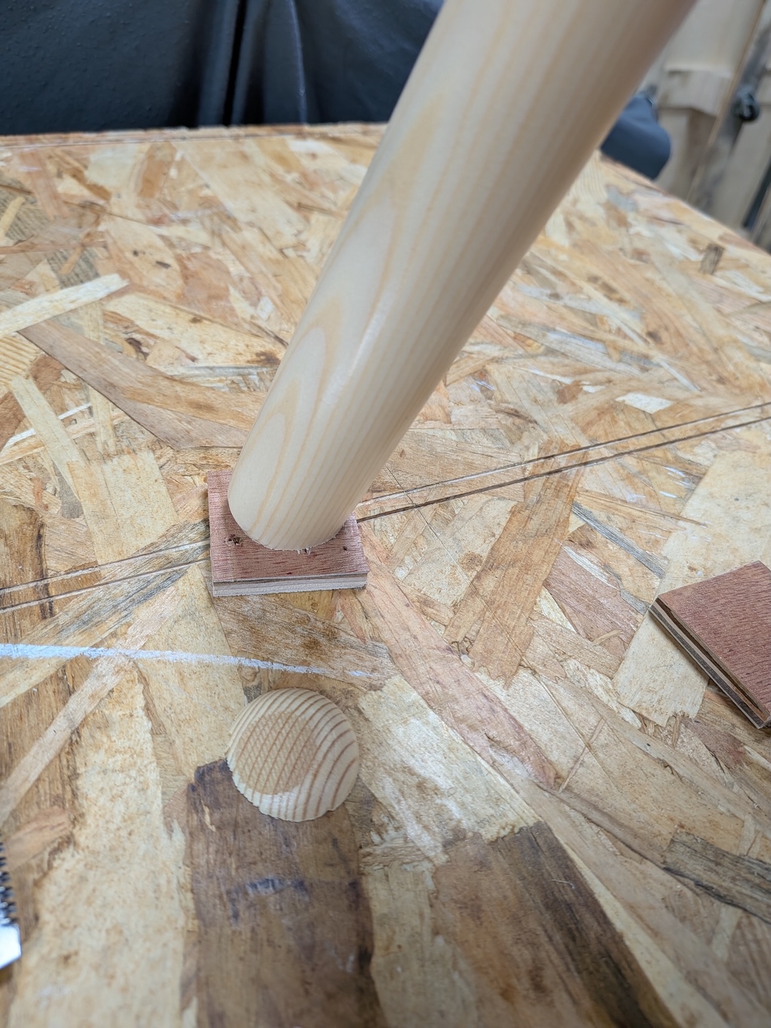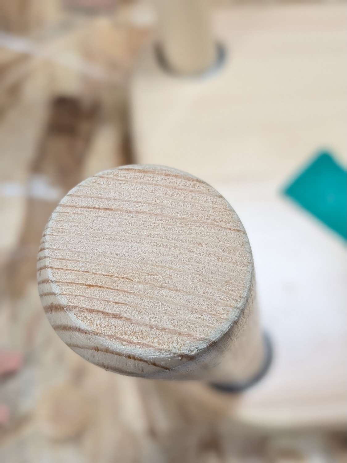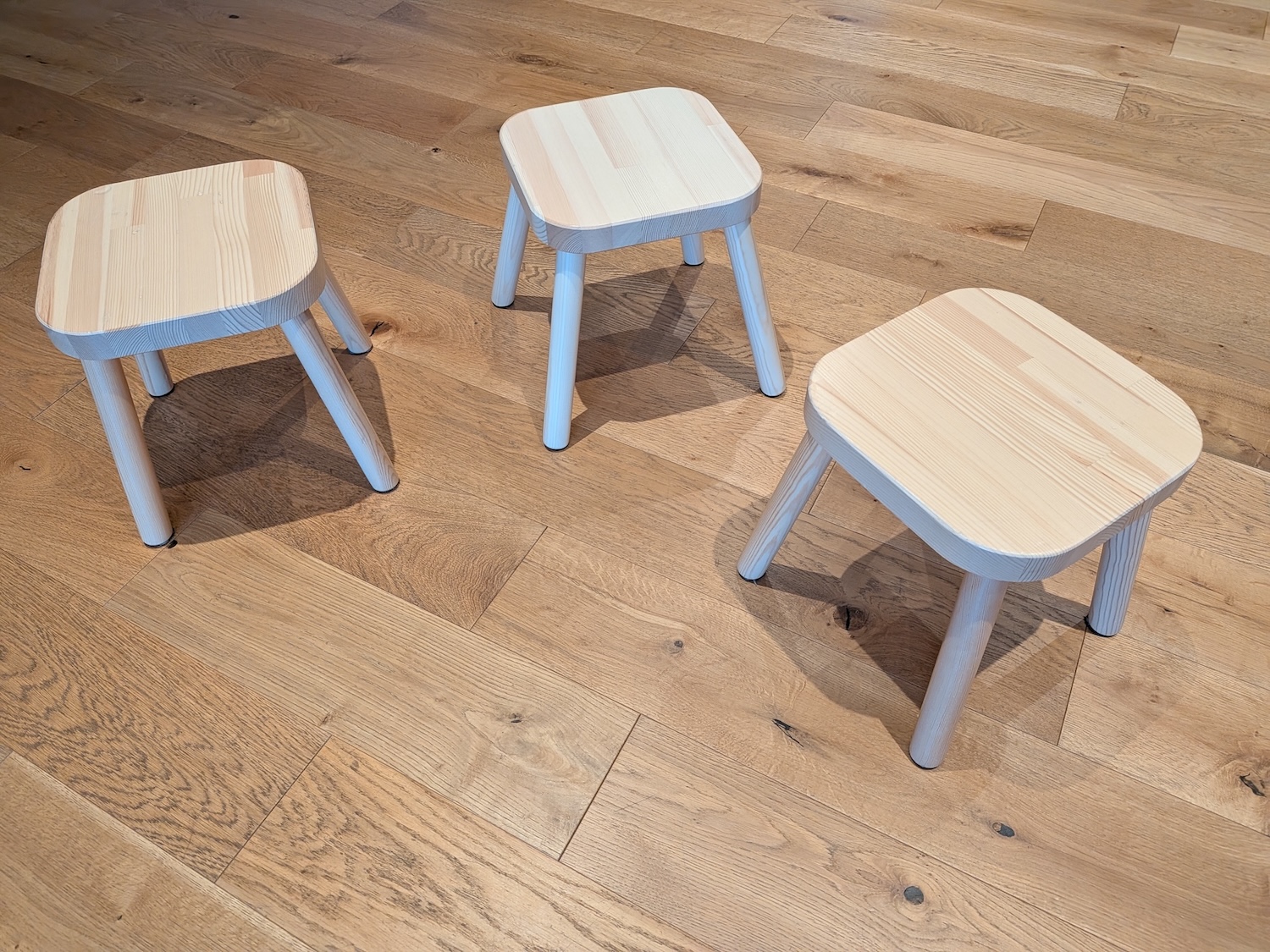 The leg ends are ball-shaped. The ball-shaped leg ends create a problem: they contact the floor at a single point, concentrating all the stool’s weight there, which may dent whatever is underneath it. Children like to put stools on top of other things, such as other softwood stools, which are prone to being dented.