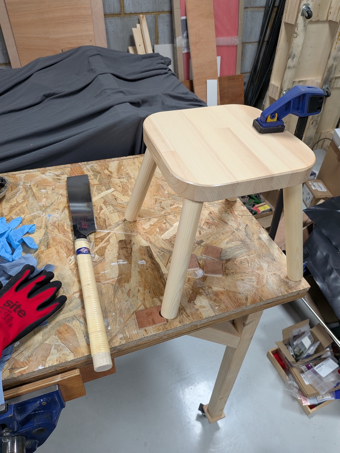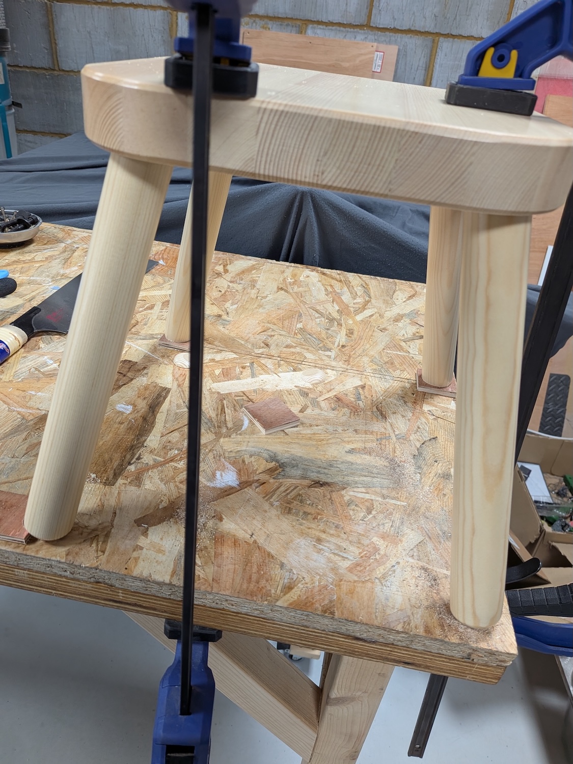 Of course, the exact same height needs to be cut from each leg and the cuts must be parallel for this to work. It doesn’t have to be perfect because once there’s any weight on the stool, the wood will flex to fit, but it should be reasonably good.