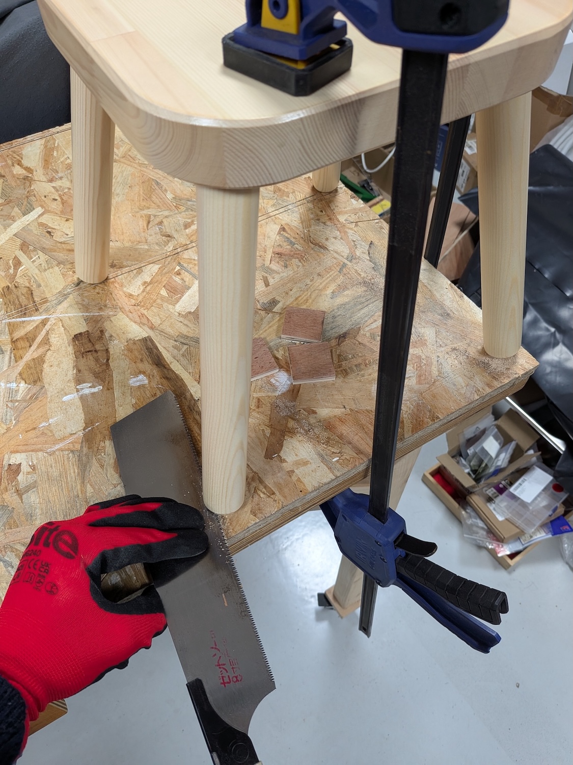 Step 1: Place the stool on a flat table and clamp it down. Place one guide piece next to a leg. Place a thin Japanese crosscut saw on the guide piece and carefully saw sideways through the leg keeping the blade in contact with the guide.